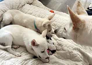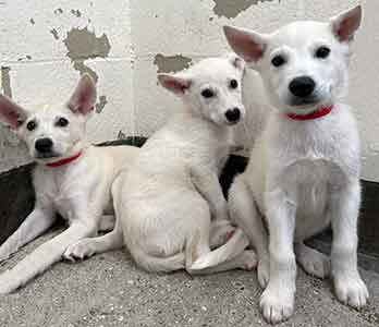 | These three beautiful 7 week old babies (DOB: 5-11-2025 ~ Mother's Day) were found as "strays" in the Los Angeles area. They were thin, flea bitten and weary -- it was unknown how long they'd been out on their own and/or had managed to survive. We hate to think that these pups were in this condition while being taken care of by someone! We first heard about them on Sunday, August 3rd. With our pullers/transporters Chuck and Jon out of commission due to a distemper outbreak, we didn't know how we could possibly help them ... but we were sure going to try!