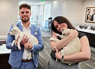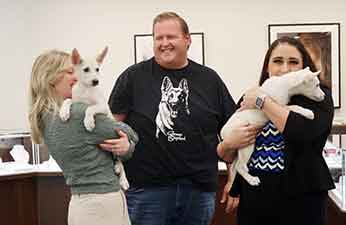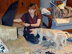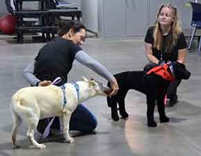 UPDATE 8/17: The pups were evaluated by two trainers, Shelby and Jamie, with Soldier's Best Friend for entry into a pilot program that plans to bring in youngsters and raise them in the SBF program so that they can be paired with veterans at 8 to 9 months. Both puppies passed with flying colors, with the trainers seeing potential in each of them. Jane weighed in at just over 10 pounds, with Milo hitting a hefty 14.5 pounds. They're growing fast!