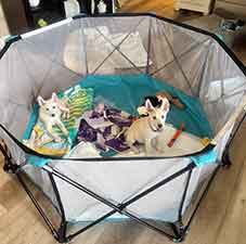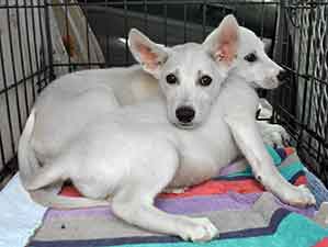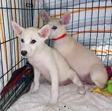 The two of them are attached at the hip. It is the cutest little thing. I really hope someone does adopt them together. I don't even know how they will deal with a separation anxiety, especially Milo, even though he's the leader, he constantly is looking for Jane. Where she looks for more human contact, he looks for her. But they both have the best personalities -- spunky cute. They're gonna be great dogs and easy -- if I call them back from something they come immediately they know it's a no no. They are so bright. They'll be easy to train!! They definitely don't like their kennel.