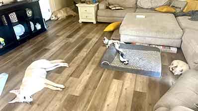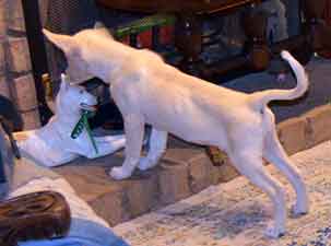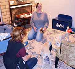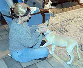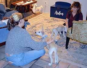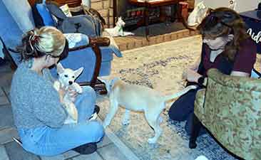 FIRST FOSTER REPORT 8/7: "Yes, they are so darling!!! And so attached to each other if one goes around the corner, the other one goes looking for them. Roo has taken to being a mommy to them several times. She's tried to grab them by the neck to move them. I am having to watch that but she feels like they're her babies as you can tell. Milo has no fear; he keeps protecting Jane.