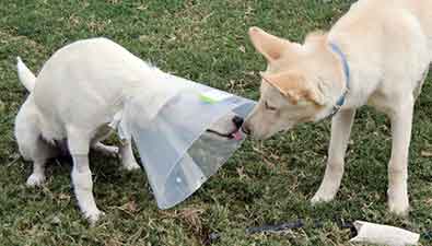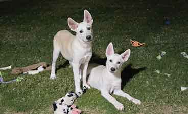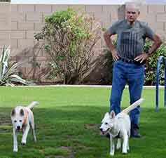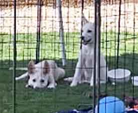 UPDATE 9/30: ![]() Milo (at left) and Jane enjoy a lazy afternoon in one of their favorite spots The puppies are growing like weeds and Milo will soon be ready for his neuter surgery. We're going to wait a bit longer for Jane, since females need more time before undergoing surgery. They are sweet and playful and just a pleasure to have around. Once Milo is neutered (in the next week or two) we will begin the separation process and offer the puppies for adoption separately. We will be sure to pair them with other partner playmates at their foster home, and they will also have play time together. UPDATE 10/6: Milo has been scheduled for his neuter surgery on October 14th. He will be checked over by our vet and updated on any vaccinations that he might need. After a suitable recovery period, which will begin with his separation from his sister, Jane, he will be available for adoption. Jane is available to a foster-to-adopt home. Her spay surgery will be scheduled in approximately a month's time. UPDATE 10/14: Milo checked in for his neuter surgery bright and early this morning. He weighed in at a very healthy 38+ pounds and was given a clean bill of health. ![]() Happy to be home in his own backyard again UPDATE 11/3: Now that they've reached 6 months of age, the Milo (orange vest) and Jane (blue vest) were re-evaluated by Shelby and Jaime from Soldier's Best Friend, with our adopter and supporter Jim, lending a helping hand, as well as the head of the Perryville Prison Program, Mary. They both passed with flying colors and were accepted into the program! Milo will be joining them around the second week in November and Jane will join after her spay on November 13th. We couldn't imagine a better outcome for these two personable pups.
