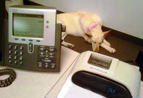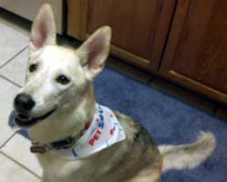 ![]() Little Kelly, found wandering in the White Tank Mountains in early 2012, shows off her new bandana after being groomed at PetsMart |