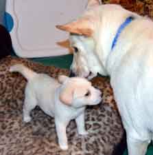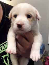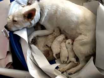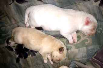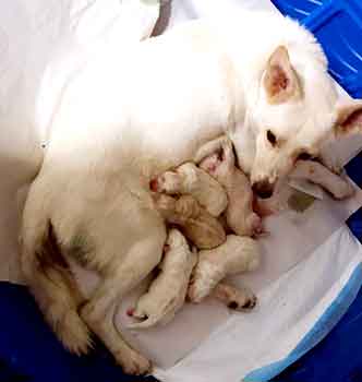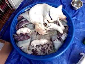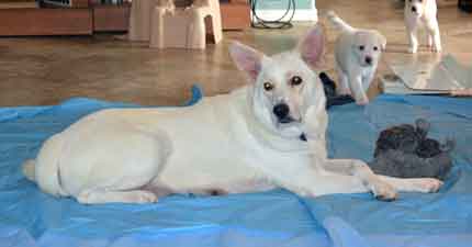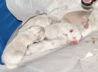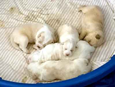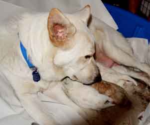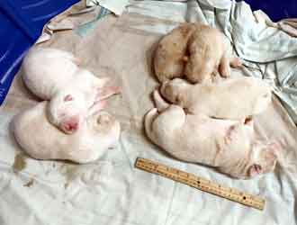 When several hours had passed with Charlotte dozing and her puppies contentedly nursing, we thought that maybe our little family of four was complete ... but we were wrong! A phone call at 9pm from Jim told us that Number 5, a tiny white boy, had just shown up!