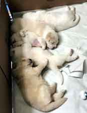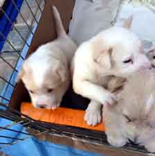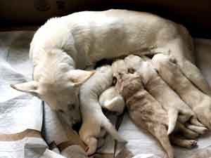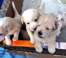 UPDATE 12/6: A call from foster dad, Jim told us, "There's a change." When we inquired, we were told we now have 4 boys and 1 girl! We'll be checking the plumbing this coming week. :) UPDATE 12/8: Growing puppies   UPDATE 12/11: Cute puppies   UPDATE 12/15: Foster dad Jim reports that the pups are already able to climb out of the wading pool that they were born in!   PUPPY UPDATE 12/17: "I think the puppies are getting teeth because Charlotte growls a little at them occasionally then pokes them with her nose and sometimes she gets up and leaves. When did we start the puppy food gruel last time? Were they 4 weeks old? I don't remember. They are getting so big, well 4 out of 5 are getting big. Almost walking, still a little wobbly."     PUPPY UPDATE 12/22: If we had to guess at this early age, we would have to say that Charlotte's puppies are part shepherd and part Golden retriever. The jury is still out.       UPDATE 12/24: