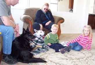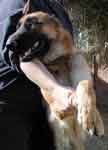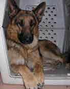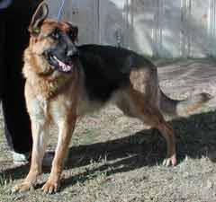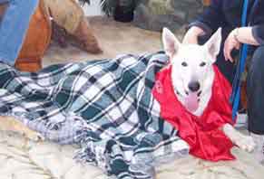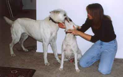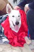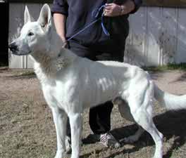 UPDATE 12/13/03: Apache was moved to his new foster home today with Lisa, Cujo (the cat) and Niki (one of our L.A. rescue kids). He seems to have settled right in, and Niki is showing him the ropes. Now he can learn what living in a real home is like and how it feels to have a sister to play with and a yard to run in. Lisa promises to fatten him up and make sure he's well loved and taken care of. Apache is very high in prey drive and will chase anything small that moves, so a home without small pets is probably the best for him. He has learned to leave the cats he is currently living with alone, but he must always be supervised as he does love to chase them. Apache has been Buddy Tagged and microchipped and will be neutered after a little weight gain and then available for adoption. UPDATE 12/19: Apache was neutered today and came through with flying colors -- he weighed in at almost 77 pounds. A 7 pound gain since his "liberation," but just a start for this big hunk of a boy. After a week of recuperation time, and a little more weight gain, Apache will be ready to go to his new home. ![]() UPDATE 1/1/04: Apache's home visit with the Brownell Family went very well. He soaked up the love and attention of Steffi and Tommy (even tolerated being blanketed and draped with a kimono by the kids), and understands that Lucy is going to be the BOSS! Looks like our boy will be moving to Estrella Ranch in the very near future! UPDATE 1/12: Apache was seen by our veterinarian today and showed a 10 pound weight gain since being rescued. Everyone at the vet's office who has followed this wonderful boy's road to recovery came to visit him and to wish him well in his new forever home. UPDATE 1/14: The Brownells came to pick up their new family member last evening. Reports of his first day are excellent. He is being patient with the children and allowing Lucy (the family's female GSD) to be the boss without question. He was allowed his freedom on a walk in the desert, and returned happily when called. Looks like our white coated "convict" is home at last. We will miss you and your loving spirit. Have a wonderful life, Apache. You certainly deserve the best. |