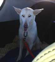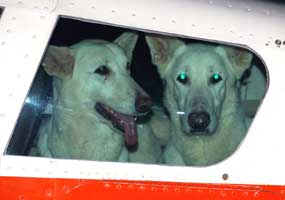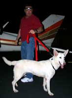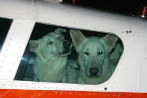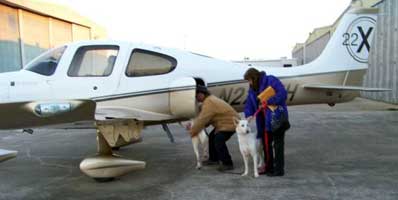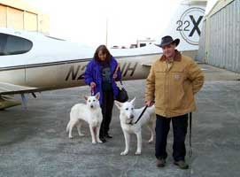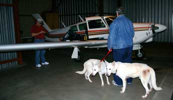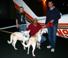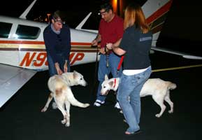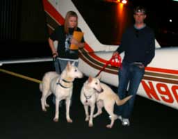 ![]() Katherine, co-pilot Ken and Dan the pilot with Caspar and Starr | ![]() WIth paperwork in hand, Katherine makes sure the dogs are OK | ![]() ![]() Starr is ready for a new life |